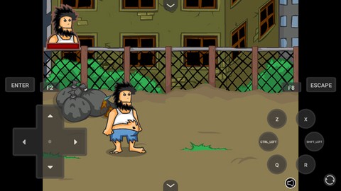 进入游戏后,流浪汉的攻击方式包括出拳和踢腿。路途上会遇到许多道具,比如黄色果子等可以捡起来使用。