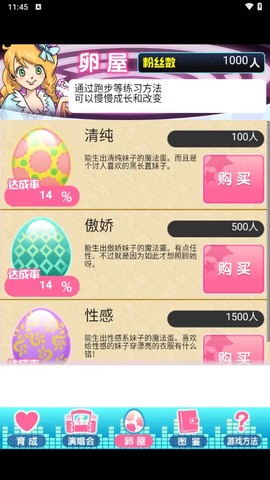 育成偶像之卵汉化版是一款极富创意的偶像养成模拟游戏,里面的魅力不仅在于简单的管理和养成,而是在于你能够为偶像塑造独特的形象和风格。每一个选择都会影响偶像的成长,你将通过精心设计的演出活动和提升偶像各项属性,让你创造出来的偶像吸引更多忠实粉丝,助力偶像事业的腾飞。如果你对偶像经营感兴趣,绝对不要错过这款游戏,赶紧下载来试玩吧!
