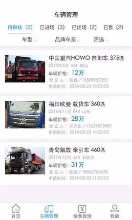 3、划分管理栏目:车辆管理区域清晰划分为待审核、已进场、已出场和已售等多个状态栏目,管理再无烦恼。