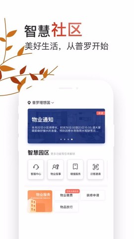 2、进入首页,轻松浏览物业通知、智慧园区与物业服务,信息一目了然;