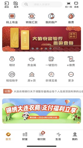 大连农商银行是一款颇具实力的掌上银行应用,专为那些希望简化日常金融事务的用户而设计。它以客户为中心,致力于将繁琐的线下办理业务变得轻松愉快,让您在安全的环境下享受高效便捷的服务体验。这款APP呈现出简约而不简单的界面,更是通过个性化设置,带给您耳目一新的交互畅快感。在这款应用中,您不仅能够完成传统的转账、投资理财、信用卡和个人贷款等基本操作,更有多项创新功能如网点地图、营销新闻和缴费服务等,打破了传统银行业务的限制,令您无论何时何地均可轻松享受在线服务。特别是为了方便年长用户,它提供了一种人性化的登录方式,让您只需用手机号和身份证号便能轻松完成注册与登录。无论您身处何地,在线金融服务都可以轻松走入家门,让高效便捷的服务成为您的日常。