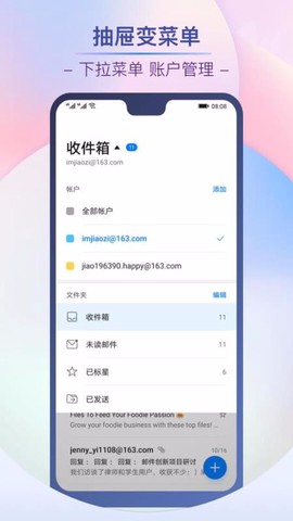 4、下拉菜单轻松管理账户,快速浏览未读邮件和已标星邮件,效率加倍;