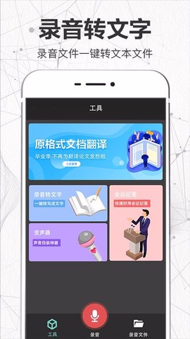 3、在工具页面灵活使用变声器、会议纪要、录音转文字及文档翻译功能。