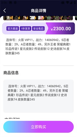 3、找到你心仪的游戏账号,点击“立即购买”,简便快捷。