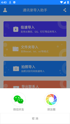 2. 【快速导入】支持将excel或txt文档中的联系人通过主流社交软件迅速打开并导入,例如,发送联系人到微信或QQ,通过“导入导出助手”快速完成导入。