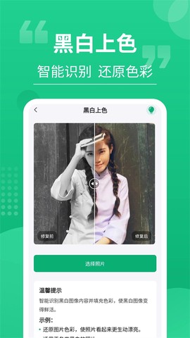 4、进入“黑白上色”功能,支持一键添加色彩,轻松让黑白照片焕发新生。
