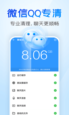 3. 【微信QQ清理】独特的聊天缓存识别功能,帮你释放大量空间,再也不怕没位置了!