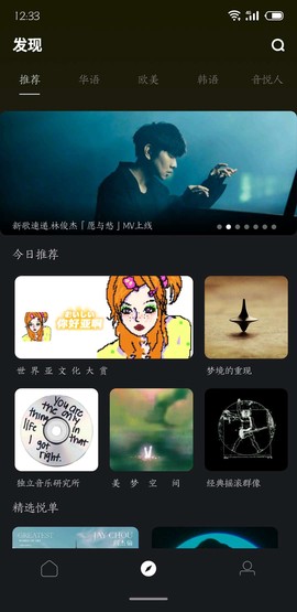 5. 另外,用户也可以在搜索页按个人喜好查找各类音乐视频、悦单、话题和艺人,甚至在我的页面查看自己创作、喜爱的悦单,让你的音乐之旅如影随形。