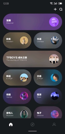 1. 软件的首页设计清新简洁,直接为你呈现多元化的分类,包括金曲、新歌、宝藏等,涵盖欧美、华语、韩语、日语等多种风格,用户还可通过输入歌曲名或歌手姓名来寻找心仪的音乐。
