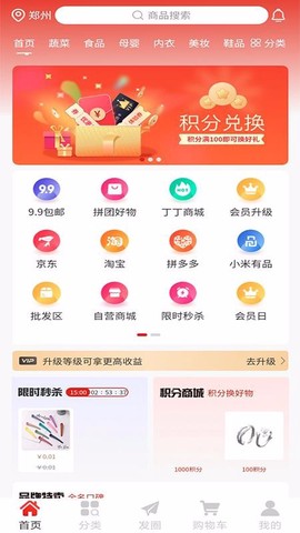 2、进了首页,能够看到限时秒杀、积分商城、会员升级等各个专区,机会多多,千载难逢。