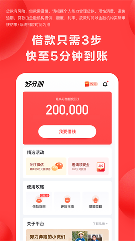 好分期定位为一个在线借贷与购物分期的平台,专为年轻用户量身打造。提供现金贷款、在线购物分期、信用卡申请等多项功能,年龄在23至60周岁的用户凭身份证就能方便申请。整个流程简单明了,申请到放款只需三步,签约到放款最快可在一分钟内获得最高50000元的借款额度。借款一万元的日常费用少得让你意想不到,仅需三块三,综合年化费率最低还可低至11.88%。