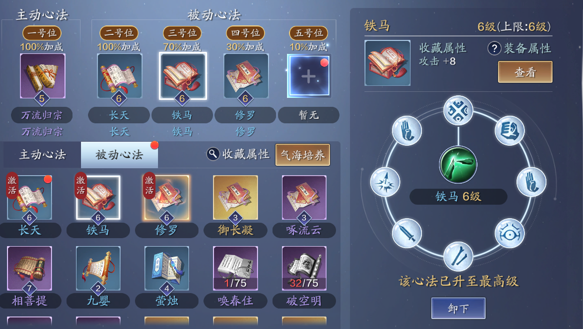 潜修的核心在于通过重复使用相同心法书积累潜修值,每消耗一本心法书可提供固定数值的潜修点数。以紫色品质的悲回风为例,每本心法书可转化为100点潜修值,而金色心法则需更高阶资源。玩家需优先通过副本掉落、拍