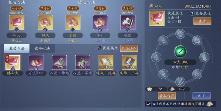 新版炼武心法(包括力道、气劲、根骨、身法、洞察五大分支)依然需通过荡剑币商店兑换,每本心法需消耗50个残页(合计75000荡剑币)。玩家需前往游戏界面财富-心法兑换-残页兑换心法中选择对应金色心法完成